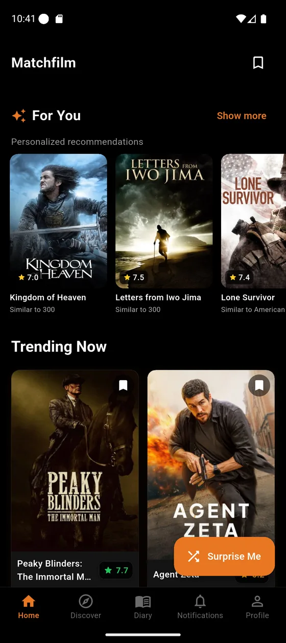 Tus valoraciones y tu actividad alimentan el feed: Matchfilm resalta títulos que encajan con tu perfil.