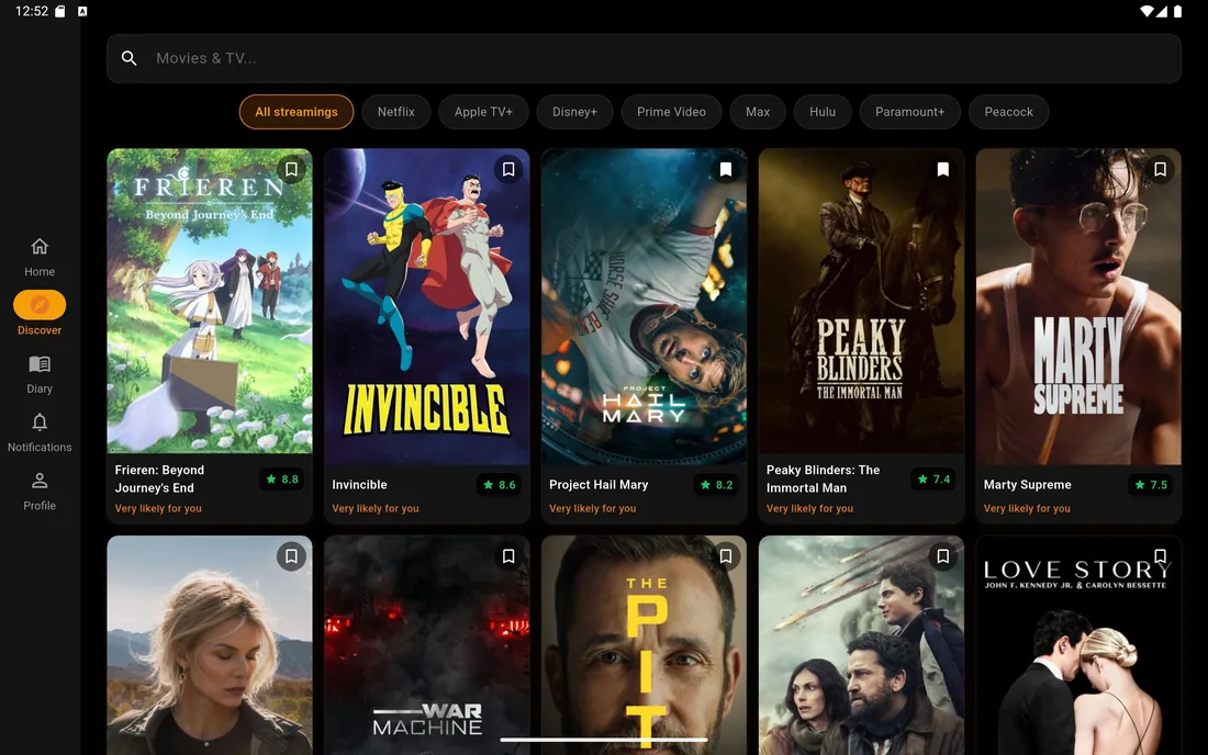 Descubre películas y series, organiza tu lista para ver, sigue a actores y directores, valora tus visionados y comparte tu gusto con amigos — en una interfaz oscura y cinematográfica que se siente igual de cuidada en el móvil que en la tablet.